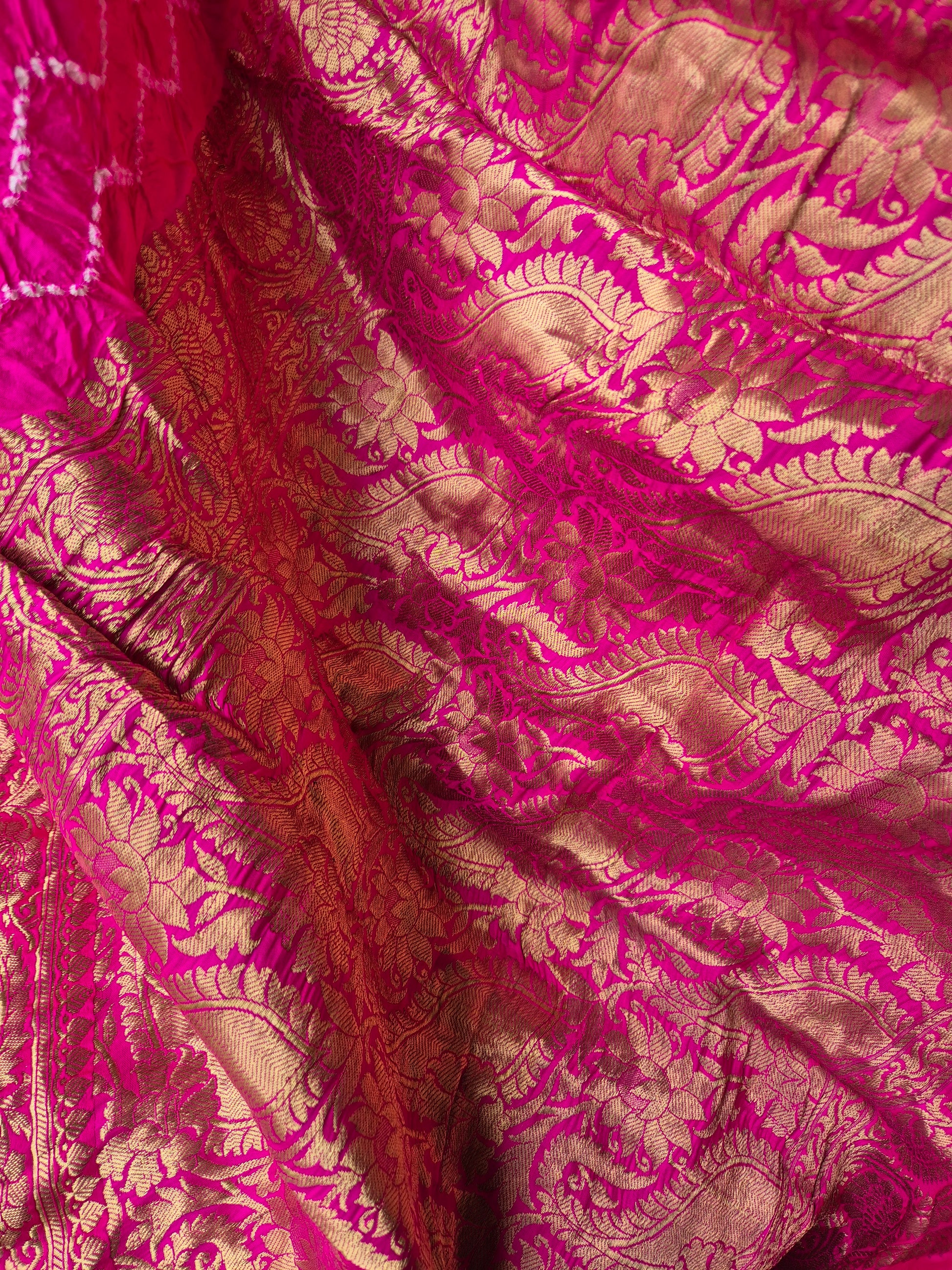 Pure Katan silk Rani Pink Banarasi Rai Bandhej Saree