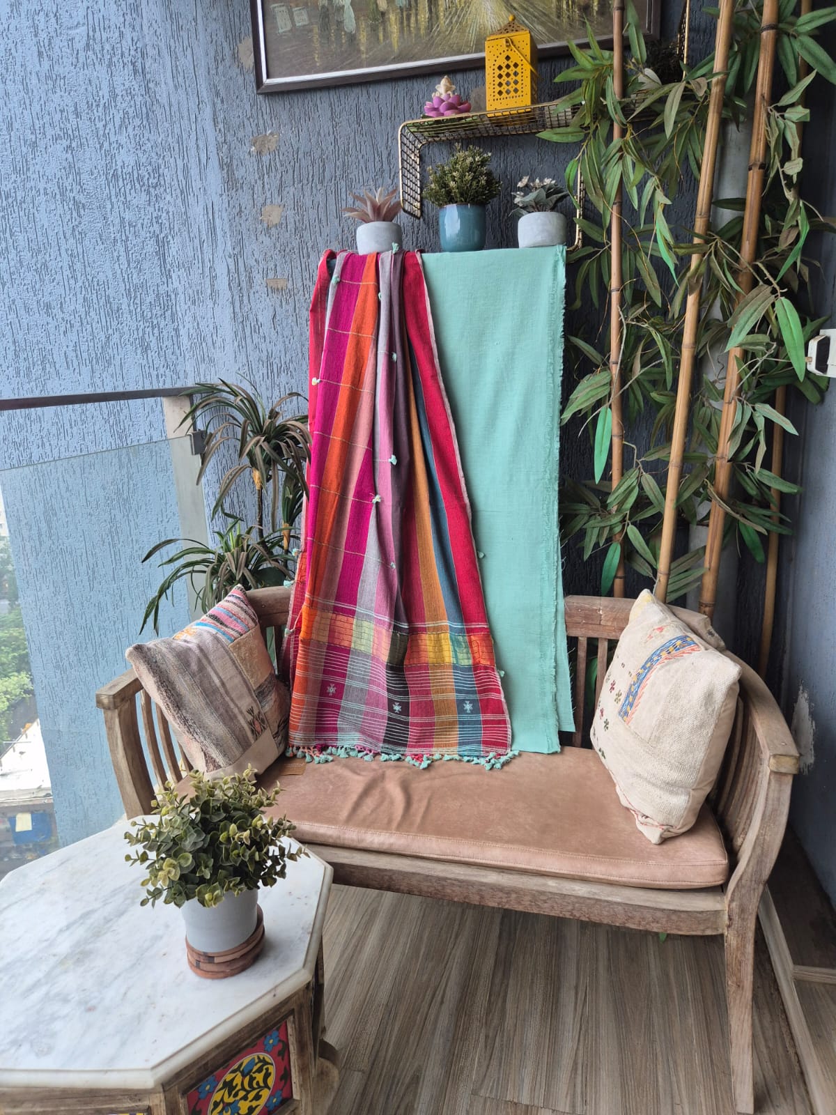 Sea Green with multi color dupatta Kala Cotton Kutchi Weave Suit