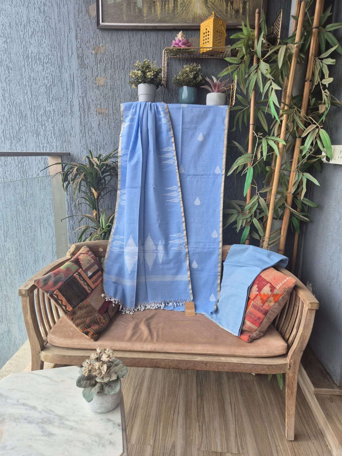 Vithika’s Paarmita Collection Brings you Jamdani Meghdhanushi series. Handwoven Cotton Jamdani 3pc Suits. Kolkatta Special Jamdani Suits are perfect for all season. Its elegantand graceful. Fabric is very soft and breathable. Check this elegant Sky Blue and White colour Jamdani suit which has zari and cotton thread weaving. This is our take on traditional Jamdani weave.